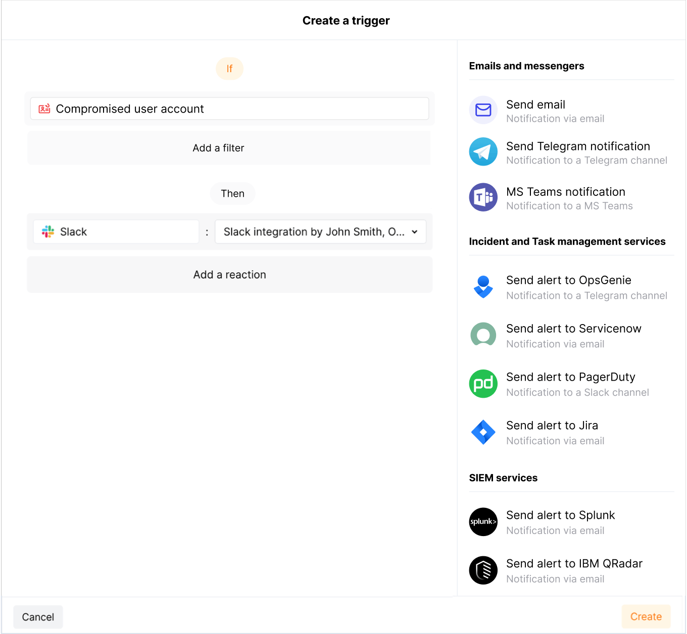 Trigger example: notification about an attempt to use compromised credentials in Slack