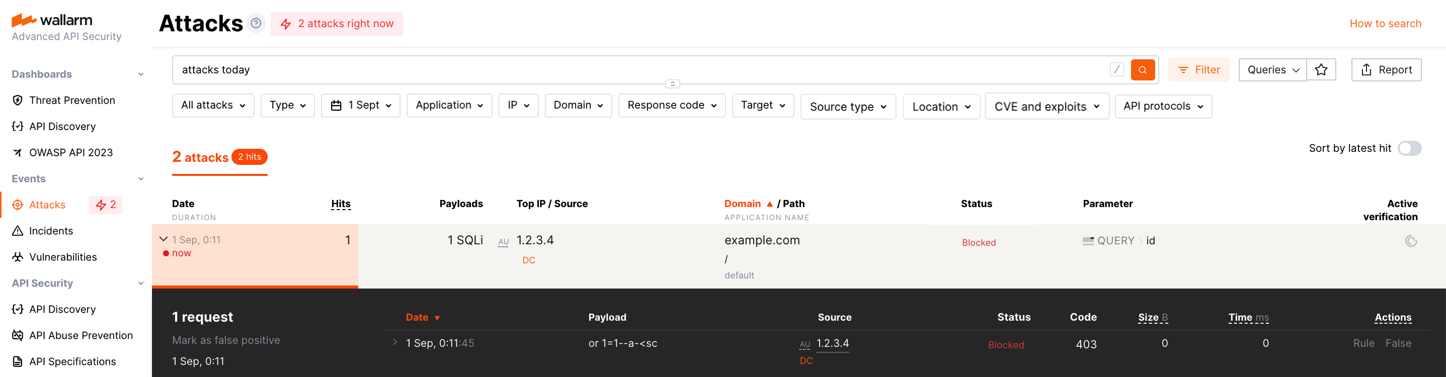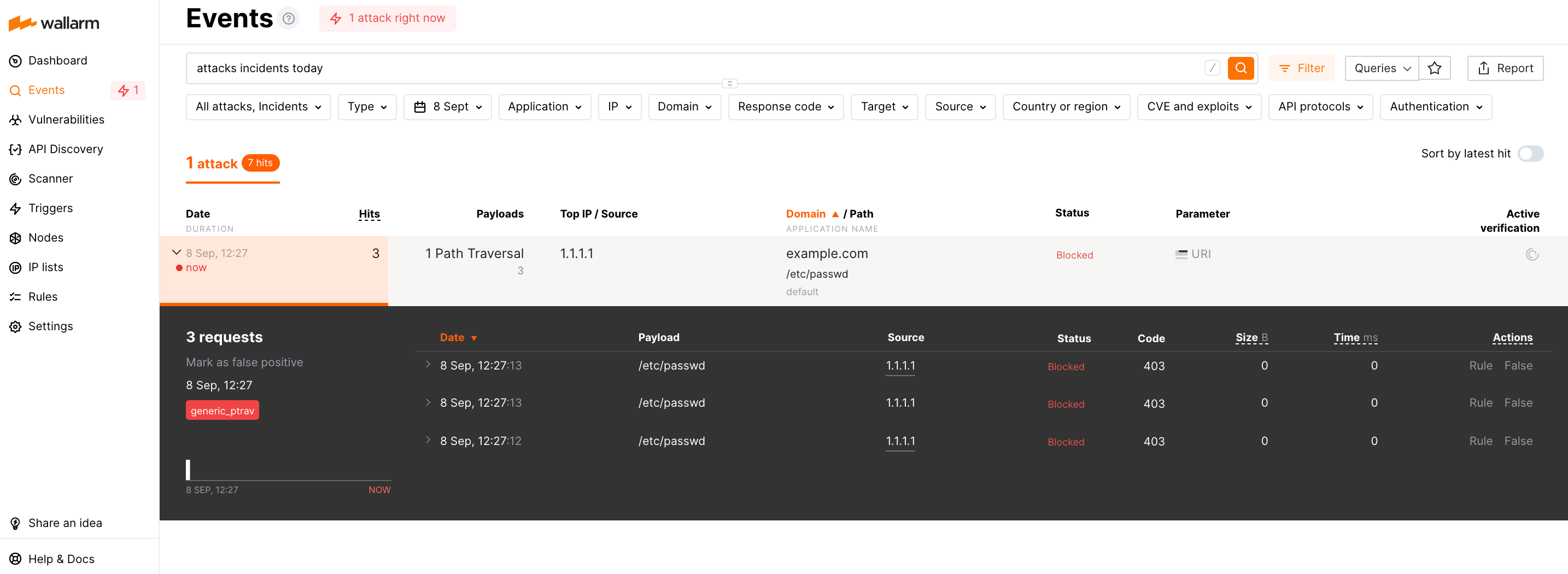 An incident, just like an attack, is an entity external to your system and is a characteristic of the outside Internet, not the system itself. Despite the fact that the attacks targeted at existing vulnerabilities are a minority, they are of the utmost importance in terms of information security. Wallarm automatically detects the attacks targeted at existing vulnerabilities and displays them as a separate object - incident.
