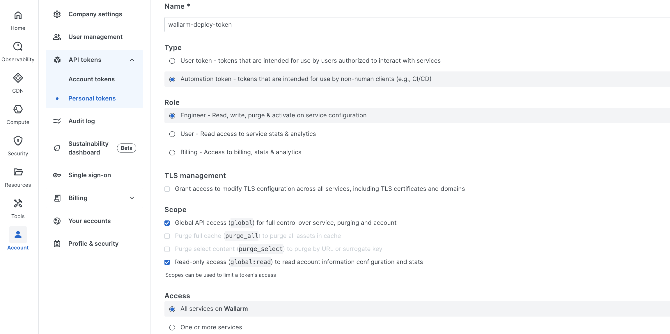 2. Go to Fastly UI → AccountAPI tokensPersonal tokensCreate token: