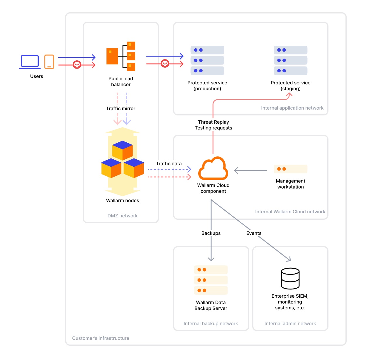 The Wallarm Cloud component is deployed within your internal infrastructure and must reside in an isolated network segment and on separate secure servers, separated by a firewall from the Internet and other parts of the internal network.